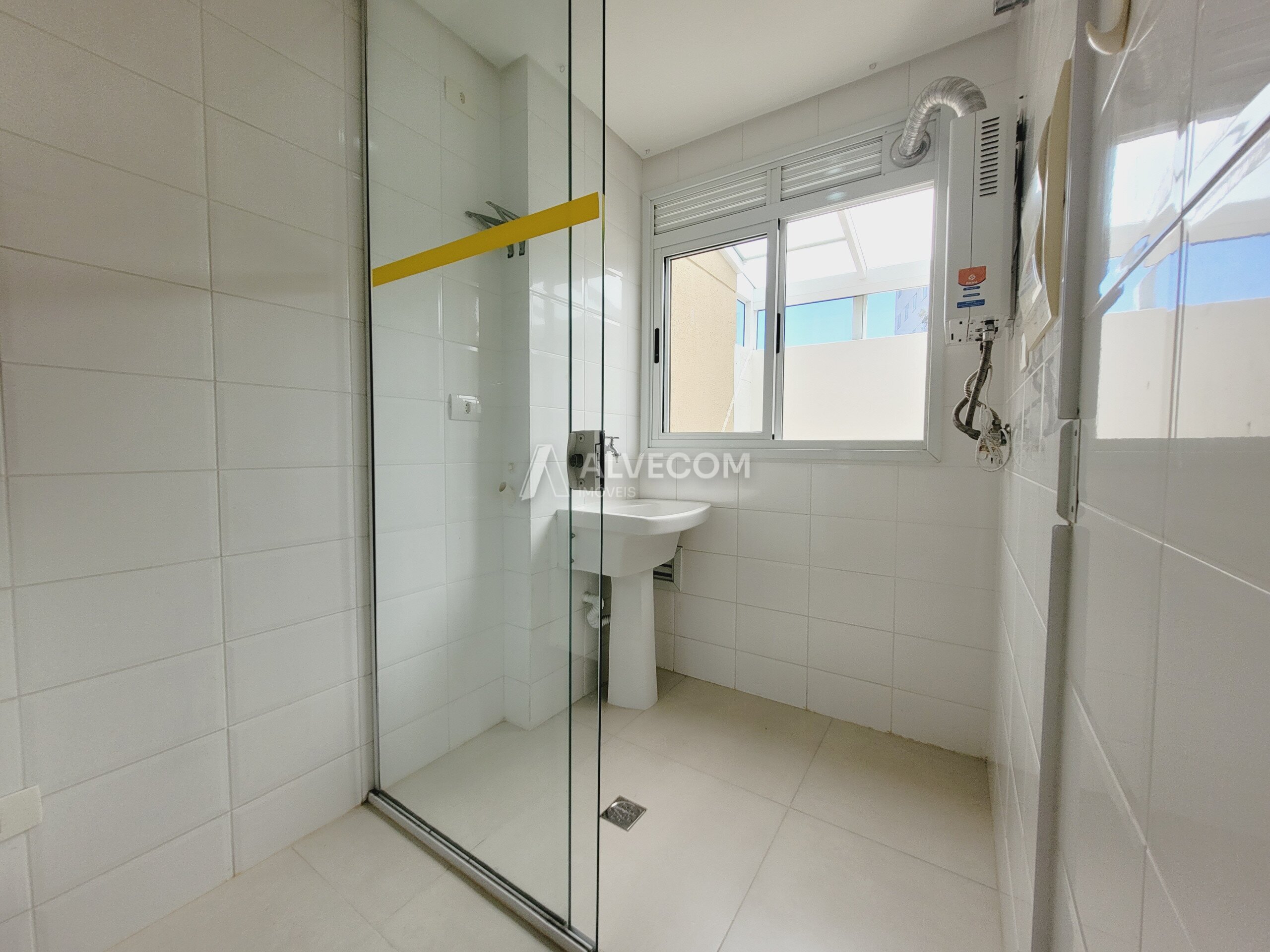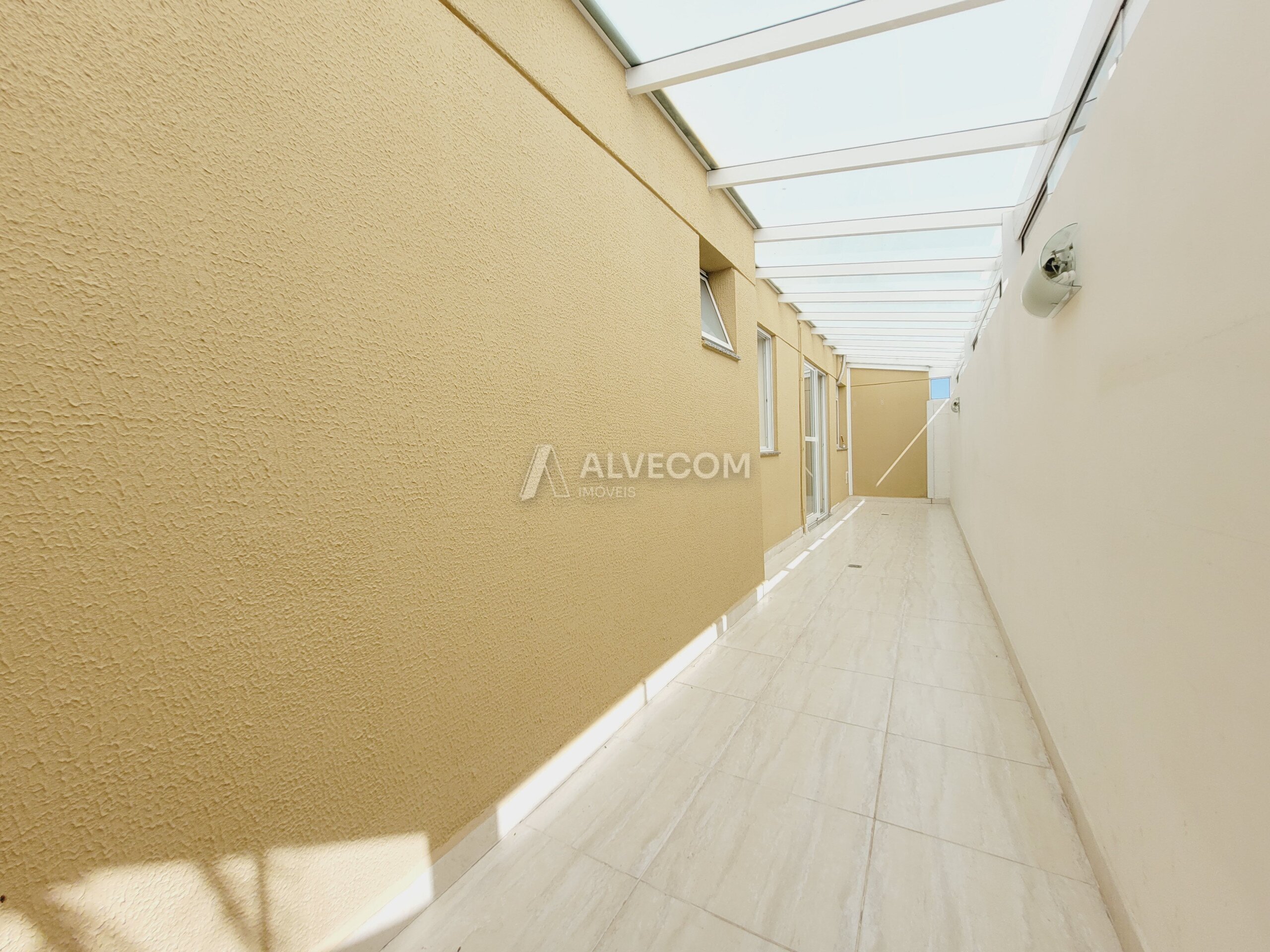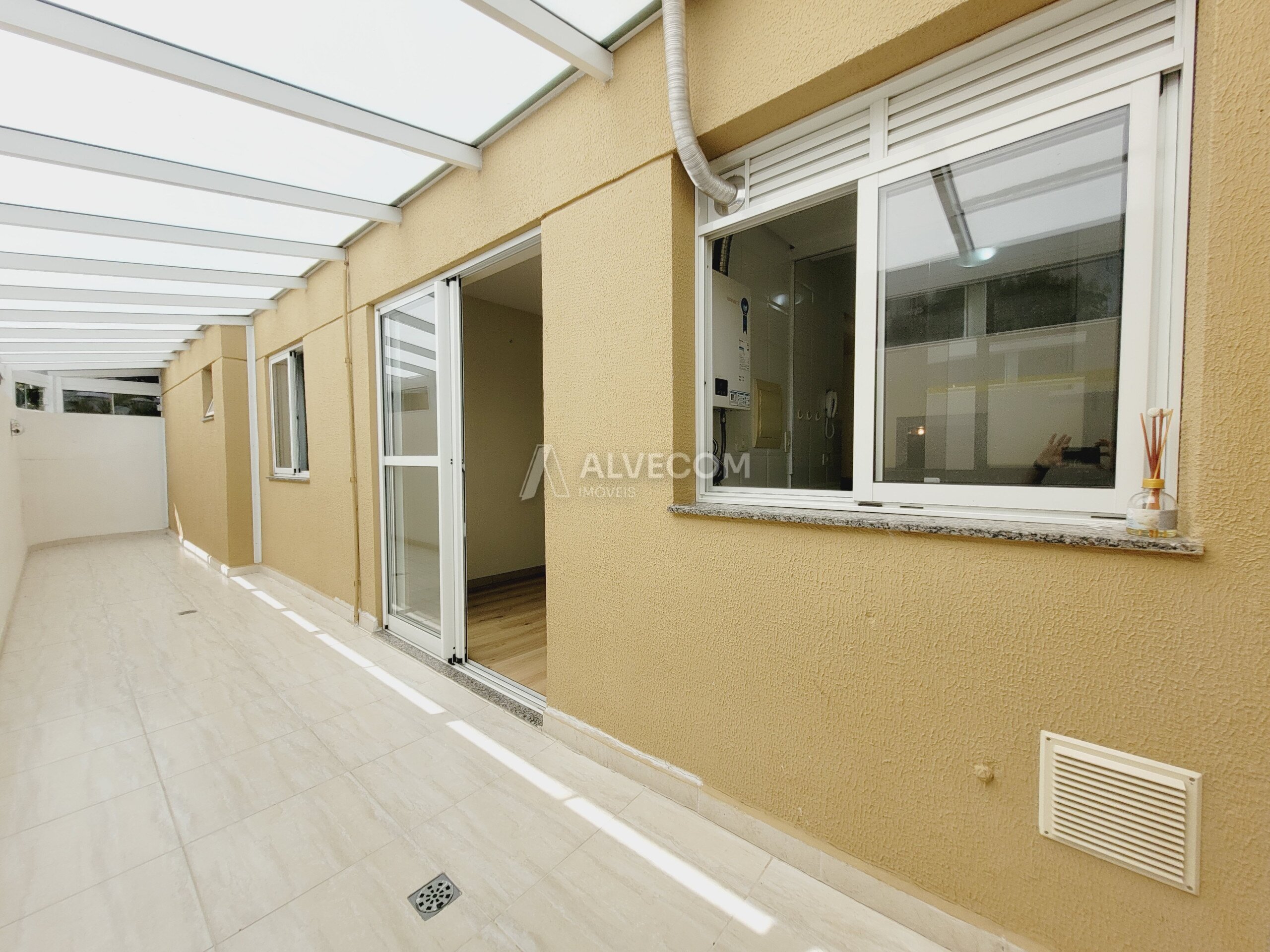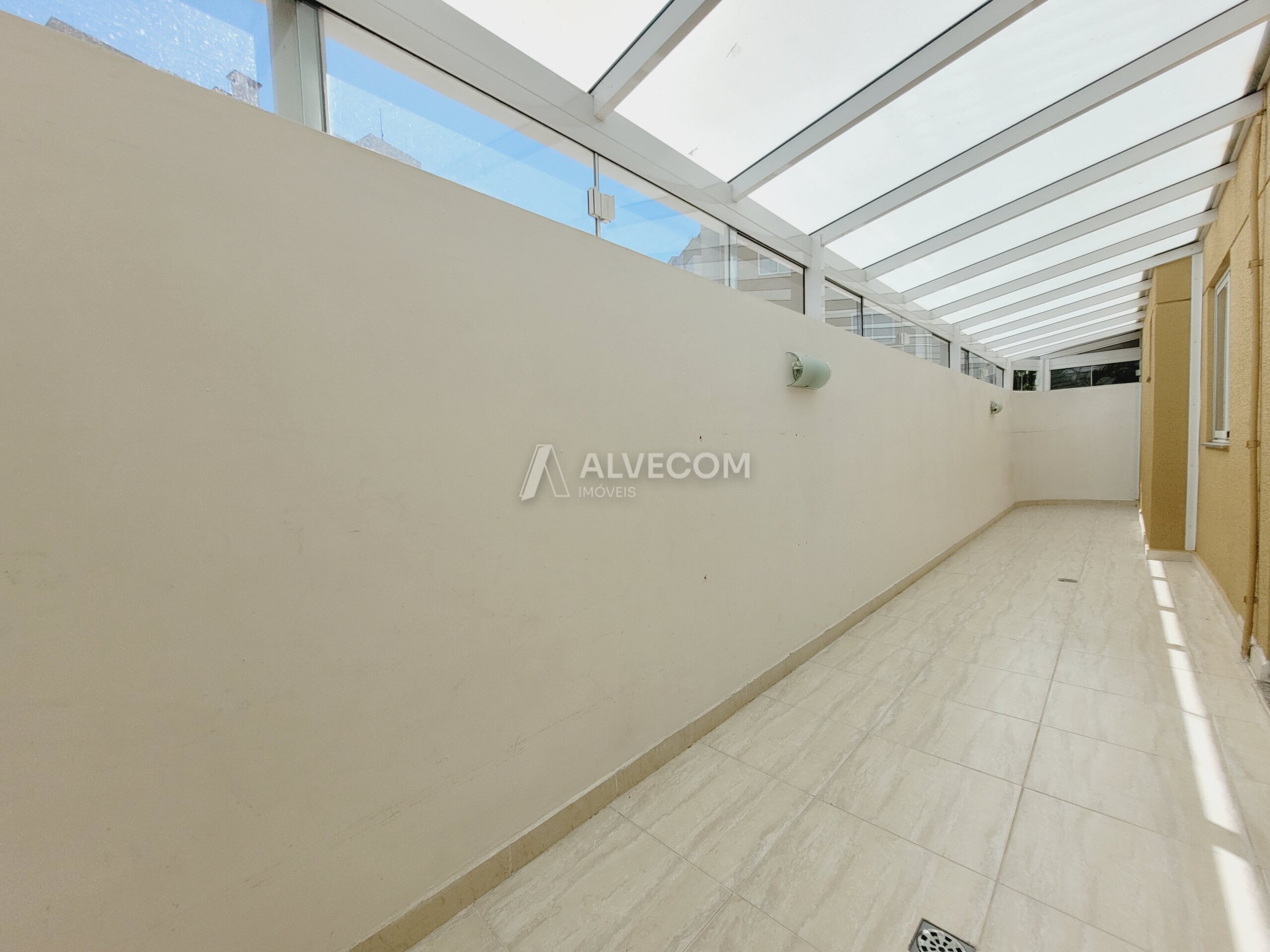 Um dos grandes destaques é o garden coberto de 15,87 m², que amplia o espaço de convivência do apartamento. A área conta com estrutura em alumínio branco e vidro temperado, garantindo iluminação natural, ventilação e proteção contra chuva.